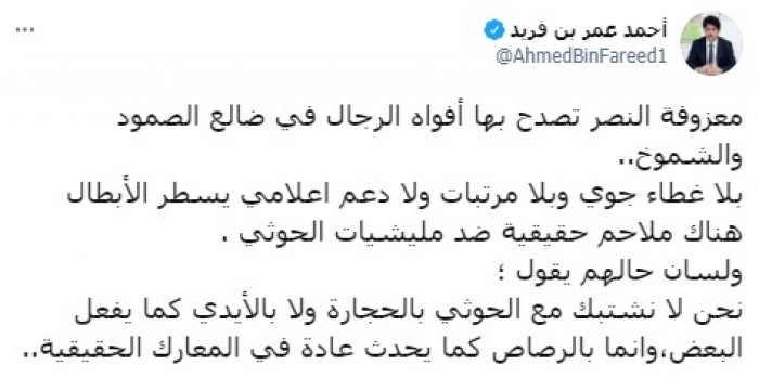 وأضاف أنه: "يسطر الأبطال هناك ملاحم حقيقية ضد مليشيات الحوثي، ولسان حالهم يقول؛ نحن لا نشتبك مع الحوثي بالحجارة ولا بالأيدي كما يفعل البعض، وإنما بالرصاص كما يحدث عادة في المعارك الحقيقية".