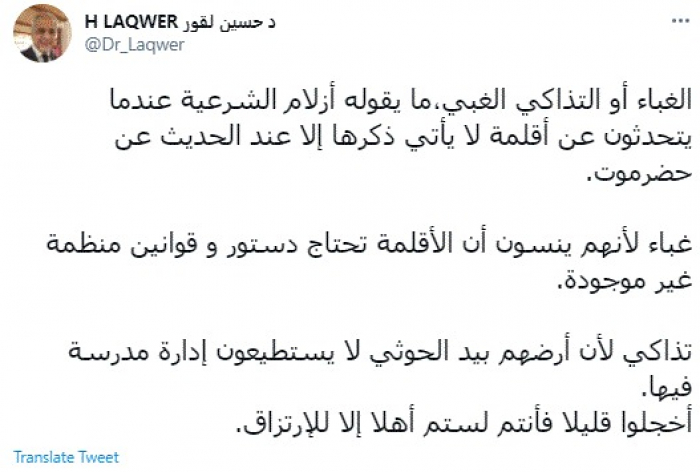 وقال في تغريدة عبر "تويتر" رصدها "المشهد العربي": "الغباء أو التذاكي الغبي،ما يقوله أزلام الشرعية عندما يتحدثون عن أقلمة لا يأتي ذكرها إلا عند الحديث عن حضرموت".