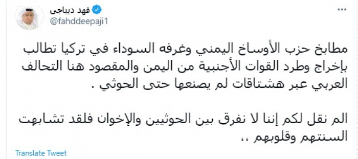وكتب في تغريدة عبر "تويتر" رصدها "المشهد العربي": "مطابخ حزب .... اليمني وغرفه السوداء في تركيا تطالب بإخراج وطرد القوات الأجنبية من اليمن والمقصود هنا التحالف العربي عبر هشتاقات لم يصنعها حتى الحوثي".