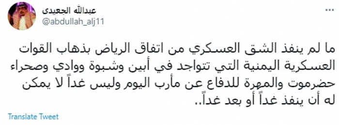 الجعيدي يدعو لضرورة تنفيذ الشق العسكري من اتفاق الرياض