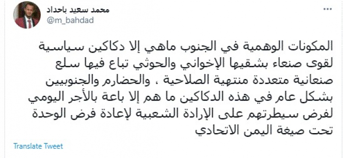 وكتب في تغريدة عبر "تويتر" رصدها "المشهد العربي": "المكونات الوهمية في الجنوب ماهي إلا دكاكين سياسية لقوى صنعاء بشقيها الإخواني والحوثي تباع فيها سلع صنعانية متعددة منتهية الصلاحية".