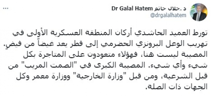 وأشار في تغريدة على حسابه بموقع التدوين المصغر تويتر، اليوم إلى أن: "تورط العميد الحاشدي أركان المنطقة العسكرية الأولى في تهريب الوعل البرونزي الحضرمي إلى قطر يعد غيضا من فيض".
