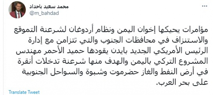 وقال في تغريدة عبر "تويتر" رصدها "المشهد العربي": "مؤامرات يحيكها إخوان اليمن ونظام أردوغان لشرعنة التموقع والاستنزاف في محافظات الجنوب والتي تتزامن مع إدارة الرئيس الأمريكي الجديد بايدن يقودها حميد الأحمر مهندس المشروع التركي باليمن".