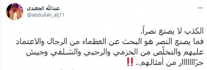 وأضاف: "فما يصنع النصر هو البحث عن العظماء من الرجال والاعتماد عليهم والتخلّص من الحزمي والرحبي والشلفي وجيش جرّااااااار من أمثالهم".