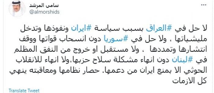وقال في تغريدة عبر "تويتر" رصدها "المشهد العربي": "لا حل في العراق بسبب سياسة إيران ونفوذها وتدخل مليشياتها، ولا حل في سوريا دون انسحاب قواتها ووقف انتشارها وتمددها، ولا مستقبل أو خروج من النفق المظلم في لبنان دون إنهاء مشكلة سلاح حزبها، ولا إنهاء للانقلاب الحوثي إلا بمنع إيران من دعمها".