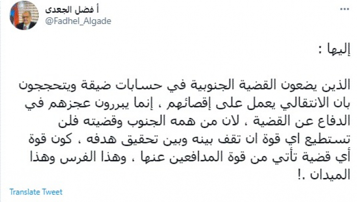 وكتب في تغريدة عبر "تويتر" رصدها "المشهد العربي": "الذين يضعون القضية الجنوبية في حسابات ضيقة ويتحججون بأن الانتقالي يعمل على إقصائهم، إنما يبررون عجزهم في الدفاع عن القضية".