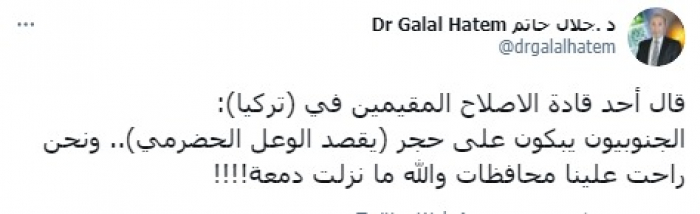 وأوضح في تغريدة على حسابه بموقع التدوين المصغر تويتر، اليوم أنه: "قال أحد قادة الإصلاح المقيمين في (تركيا): الجنوبيون يبكون على حجر (يقصد الوعل الحضرمي)، ونحن راحت علينا محافظات والله ما نزلت دمعة!!!!".