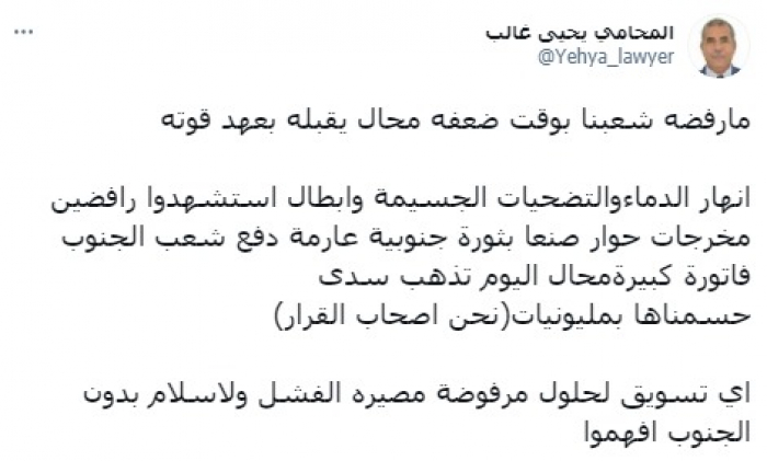 ولفت إلى أن: "أنهار الدماء والتضحيات الجسيمة وأبطال استشهدوا رافضين مخرجات حوار صنعاء بثورة جنوبية عارمة دفع شعب الجنوب فاتورة كبيرة محال اليوم تذهب سدى".