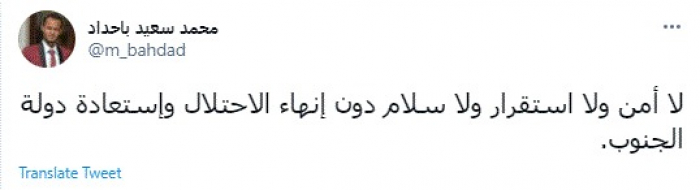وكتب في تغريدة عبر "تويتر" رصدها "المشهد العربي": "لا أمن ولا استقرار ولا سلام دون إنهاء الاحتلال واستعادة دولة الجنوب".