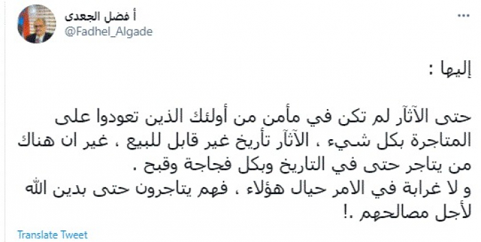 وقال في تغريدة عبر "تويتر" رصدها "المشهد العربي": "حتى الآثآر لم تكن في مأمن من أولئك الذين تعودوا على المتاجرة بكل شيء، الآثآر تأريخ غير قابل للبيع، غير أن هناك من يتاجر حتى في التاريخ وبكل فجاجة وقبح".