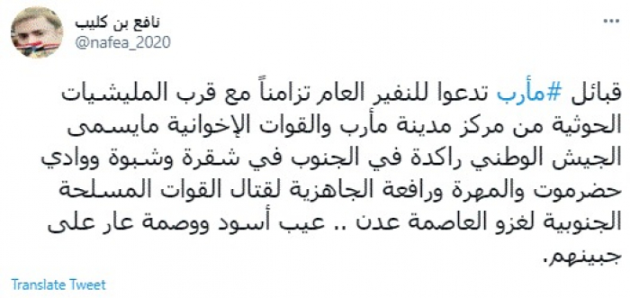 وقال في تغريدة عبر "تويتر" رصدها "المشهد العربي": "قبائل مأرب تدعوا للنفير العام تزامناً مع قرب المليشيات الحوثية من مركز مدينة مأرب والقوات الإخوانية مايسمى الجيش الوطني راكدة في الجنوب في شقرة وشبوة ووادي حضرموت والمهرة ورافعة الجاهزية لقتال القوات المسلحة الجنوبية لغزو العاصمة عدن .. عيب أسود ووصمة عار على جبينهم".