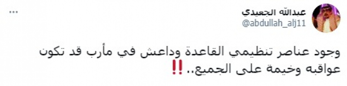 حذر الشاعر عبدالله الجعيدي من انتشار تنظيمي القاعدة وداعش الإرهابيين في مأرب، مشيرا إلى عواقب وخيمة.