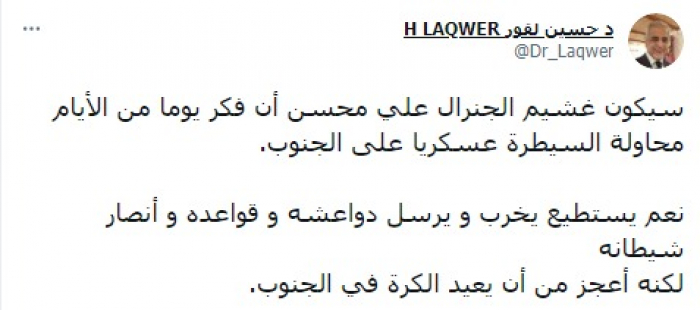وشدد في تغريدة على حسابه بموقع التدوين المصغر تويتر، اليوم على أنه: "سيكون غشيما الجنرال علي محسن إن فكر يوما من الأيام في محاولة السيطرة عسكريا على الجنوب".