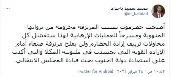 وكتب "باحداد" تغريدة عبر تويتر، رصدها "المشهد العربي": "أصبحت حضرموت بسبب المرتزقة محرومة من ثرواتها المنهوبة ومسرحًا للعمليات الإرهابية".