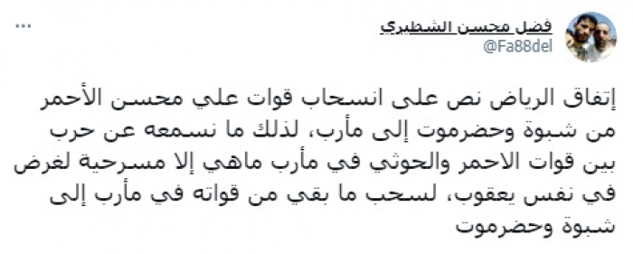 وشدد في تغريدة على حسابه بموقع التدوين المصغر تويتر، اليوم على أن: "اتفاق الرياض نص على انسحاب قوات علي محسن الأحمر من شبوة وحضرموت إلى مأرب".