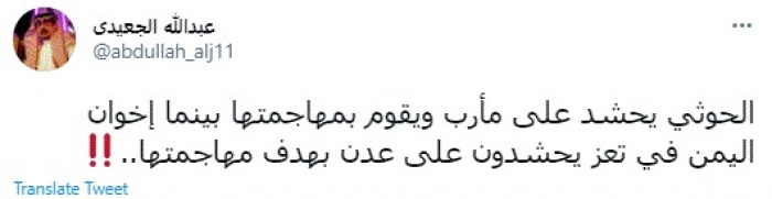 وكتب في تغريدة عبر "تويتر" رصدها "المشهد العربي": "الحوثي يحشد على مأرب ويقوم بمهاجمتها بينما إخوان اليمن في تعز يحشدون على عدن بهدف مهاجمتها".