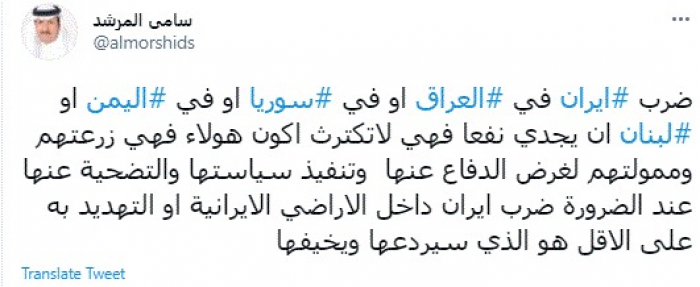 وقال في تغريدة عبر "تويتر" رصدها "المشهد العربي": "ضرب إيران في العراق أو في سوريا أو في اليمن أو لبنان لن يجدي نفعا فهي لا تكترث لكون هولاء فهي زرعتهم وممولتهم لغرض الدفاع عنها وتنفيذ سياستها والتضحية عنها عند الضرورة".