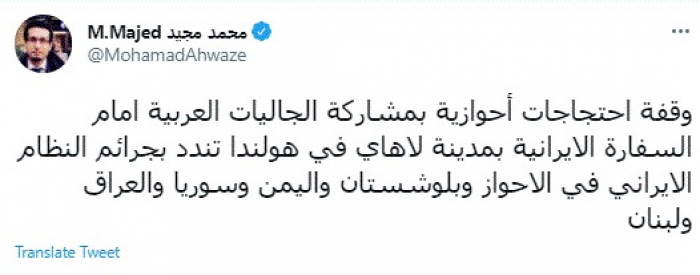 وقال في تغريدة عبر "تويتر" رصدها "المشهد العربي": "وقفة احتجاجات أحوازية بمشاركة الجاليات العربية أمام السفارة الإيرانية بمدينة لاهاي في هولندا تندد بجرائم النظام الإيراني في الأحواز وبلوشستان واليمن وسوريا والعراق ولبنان".