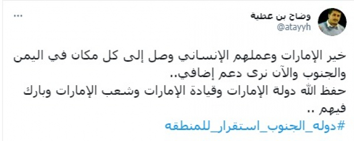 وقال في تغريدة على حسابه بموقع التدوين المصغر تويتر، اليوم إن: "خير الإمارات وعملهم الإنساني وصل إلى كل مكان في اليمن والجنوب والآن نرى دعما إضافيا".