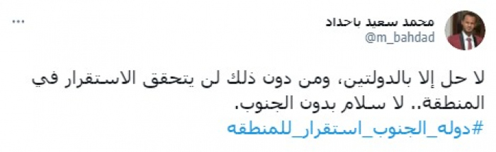 شدد الناشط السياسي محمد سعيد باحداد على أنه لا استقرار أو سلام في المنطقة بدون دولة الجنوب.
