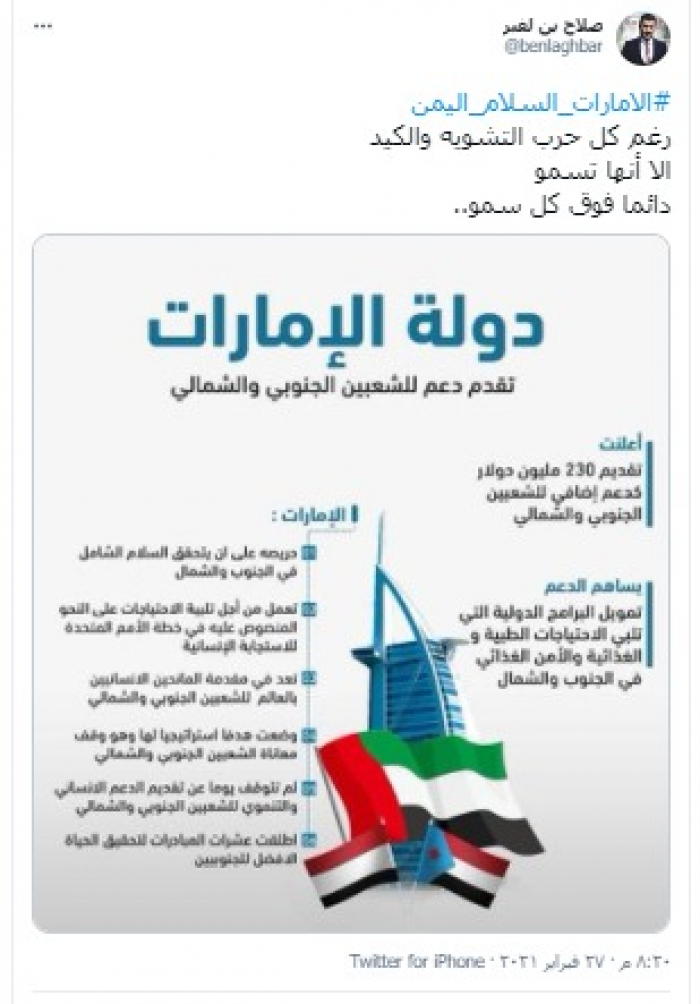 وكتب "بن لغبر" تغريدة عبر حسابه بتويتر، رصدها "المشهد العربي": " #الإمارات _ السلام _ اليمن، رغم كل حرب التشويه والكيد إلا أنها تسمو دائما فوق كل سمو".