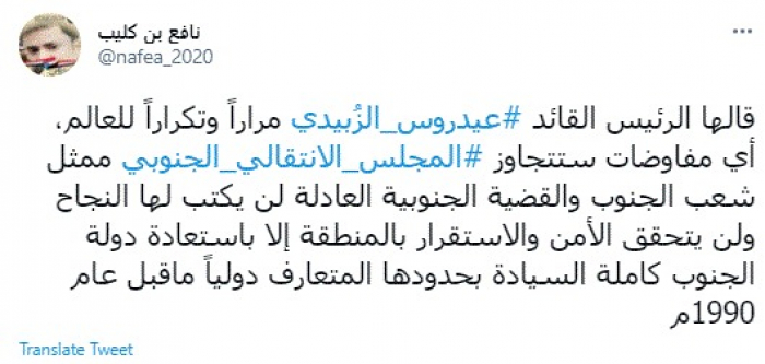 وكتب في تغريدة عبر "تويتر" رصدها "المشهد العربي": "قالها الرئيس القائد عيدروس الزُبيدي مرارًا وتكرارًا للعالم، أي مفاوضات ستتجاوز المجلس الانتقالي الجنوبي ممثل شعب الجنوب والقضية الجنوبية العادلة لن يكتب لها النجاح ولن يتحقق الأمن والاستقرار بالمنطقة إلا باستعادة دولة الجنوب كاملة السيادة بحدودها المتعارف دوليًا ماقبل عام 1990م".