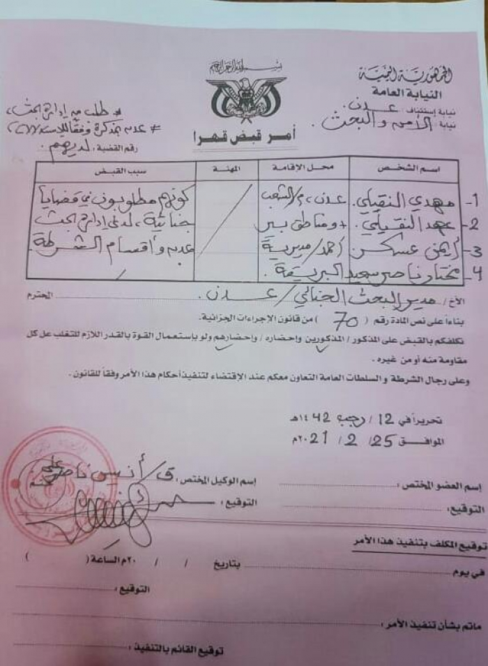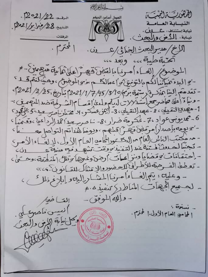 وأجبر المدعو الموساي وكيل نيابة الأمن والبحث القاضي أنيس ناصر علي إلغاء قراره بالقبض على 8 متهمين في مذكرة وجهها إلى إدارة البحث الجنائي في العاصمة عدن.