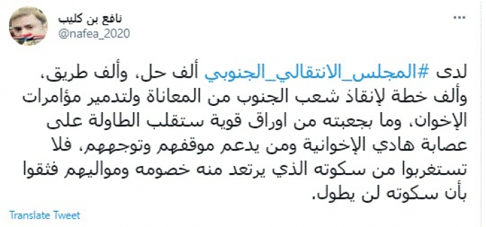 وكتب في تغريدة عبر "تويتر" رصدها "المشهد العربي": "لدى المجلس الانتقالي الجنوبي ألف حل، وألف طريق، وألف خطة لإنقاذ شعب الجنوب من المعاناة ولتدمير مؤامرات الإخوان، وما بجعبته من أوراق قوية ستقلب الطاولة على عصابة هادي الإخوانية ومن يدعم موقفهم وتوجههم، فلا تستغربوا من سكوته الذي يرتعد منه خصومه ومواليهم فثقوا بأن سكوته لن يطول".