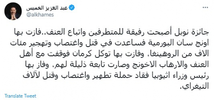 وكتب في تغريدة عبر "تويتر" رصدها "المشهد العربي": "جائزة نوبل أصبحت رفيقة للمتطرفين وأتباع العنف..فازت بها اونج سان البورمية فساعدت في قتل واغتصاب وتهجير مئات الاف من الروهينغا، وفازت بها توكل كرمان فوقفت مع أهل العنف والارهاب الإخونج وصارت تابعة ذليلة لهم، وفاز بها رئيس وزراء أثيوبيا فقاد حملة تطهير واغتصاب وقتل لآلاف التيغراي".
