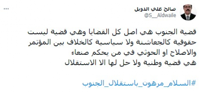 وأشار في تغريدة على حسابه بموقع التدوين المصغر تويتر، اليوم إلى أن: "قضية الجنوب هي أصل كل القضايا".