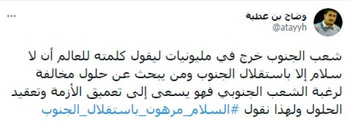 وأوضح في تغريدة على حسابه بموقع التدوين المصغر تويتر، اليوم أن: "شعب الجنوب خرج في مليونيات ليقول كلمته للعالم أن لا سلام إلا باستقلال الجنوب".