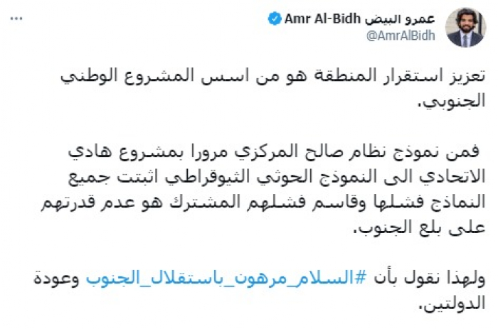 شدد عمرو البيض عضو هيئة رئاسة المجلس الانتقالي الجنوبي، على أن المشروع الجنوبي يضمن استقرار المنطقة، بعيدًا عن المشاريع الفاشلة المطروحة من الحوثيين الإرهابيين والشرعية الإخوانية.
