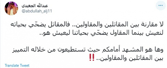وقال في تغريدة عبر "تويتر" رصدها "المشهد العربي": "لا مقارنة بين المقاتلين والمقاولين.. فالمقاتل يضحّي بحياته لنعيش بينما المقاول يضحّي بحياتنا ليعيش هو. وها هو المشهد أمامكم حيث تستطيعون من خلاله التمييز بين المقاتلين والمقاولين".