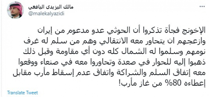 وقال في تغريدة عبر "تويتر" رصدها "المشهد العربي": "الإخونج فجأة تذكروا أن الحوثي عدو مدعوم من إيران وأزعجهم ان يتحاور معه الانتقالي وهم من سلم له غرف نومهم وسلموا له الشمال كله دون أي مقاومة وقبل ذلك ذهبوا إليه للحوار في صعدة وتحاوروا معه في صنعاء ووقعوا معه اتفاق السلم والشراكة واتفاق عدم إسقاط مأرب مقابل إعطاءه 80% من غاز مأرب".