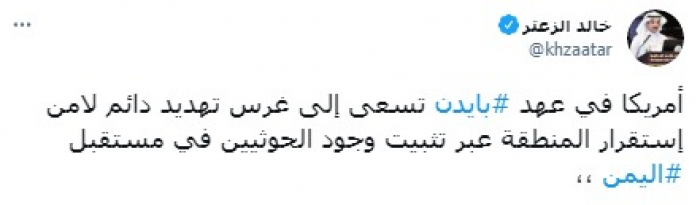 وأوضح في تغريدة على حسابه بموقع التدوين المصغر تويتر، اليوم أن: "أمريكا في عهد بايدن تسعى إلى غرس تهديد دائم لأمن واستقرار المنطقة عبر تثبيت وجود الحوثيين في مستقبل اليمن".