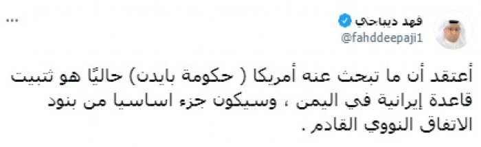 وأوضح في تغريدة على حسابه بموقع التدوين المصغر تويتر، اليوم أني: "أعتقد أن ما تبحث عنه أمريكا (حكومة بايدن) حاليًا هو ثبيت قاعدة إيرانية في اليمن، وسيكون جزءا أساسيا من بنود الاتفاق النووي القادم".