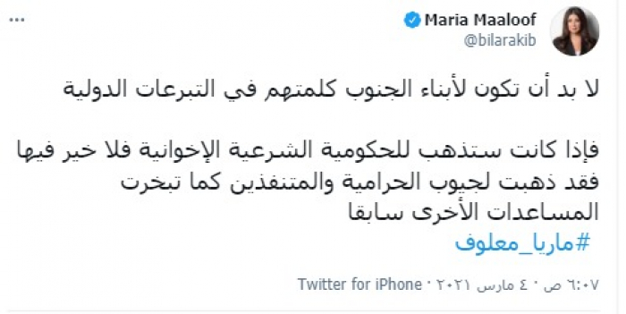 وكتبت "معلوف" تغريدة عبر حسابها بتويتر، رصدها "المشهد العربي": "لا بد أن تكون لأبناء الجنوب كلمتهم في التبرعات الدولية".