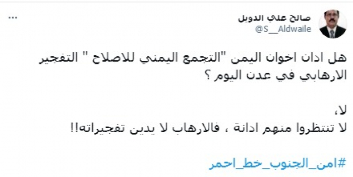 وتساءل في تغريدة على حسابه بموقع التدوين المصغر تويتر، اليوم قائلا: "هل أدان إخوان اليمن (التجمع اليمني للإصلاح) التفجير الإرهابي في عدن اليوم؟".