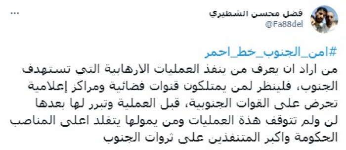 وقال في تغريدة على حسابه بموقع التدوين المصغر تويتر، اليوم: "من أراد أن يعرف من ينفذ العمليات الإرهابية التي تستهدف الجنوب، فلينظر لمن يمتلكون قنوات فضائية ومراكز إعلامية تحرض على القوات الجنوبية، قبل العملية وتبرر لها بعدها".