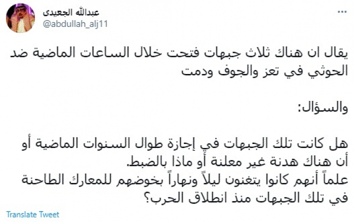 وكتب في تغريدة عبر "تويتر" رصدها "المشهد العربي": "يقال أن هناك ثلاث جبهات فتحت خلال الساعات الماضية ضد الحوثي في تعز والجوف ودمت.. والسؤال: هل كانت تلك الجبهات في إجازة طوال السنوات الماضية أو أن هناك هدنة غير معلنة أو ماذا بالضبط".