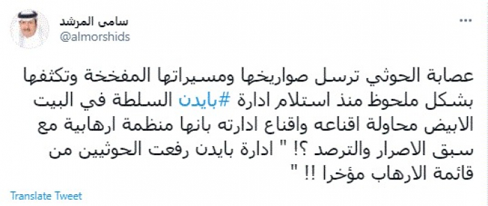 وكتب في تغريدة عبر "تويتر" رصدها "المشهد العربي": "عصابة الحوثي ترسل صواريخها ومسيراتها المفخخة وتكثفها بشكل ملحوظ منذ استلام إدارة بايدن السلطة في البيت الأبيض محاولة إقناعه وإقناع إدارته بأنها منظمة إرهابية مع سبق الإصرار والترصد".