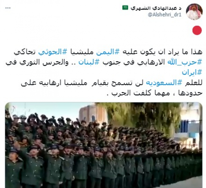 أكد المحلل السياسي السعودي عبدالهادي الشهري أن المملكة العربية السعودية لن تسمح بوجود مليشيات إرهابية على حدودها مهما كلفت الحرب.