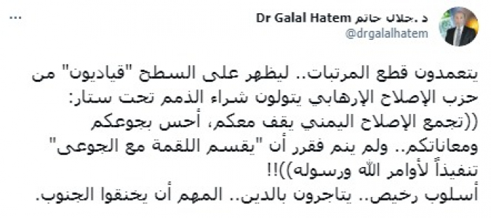 وشدد في تغريدة على حسابه بموقع التدوين المصغر تويتر، اليوم على أنهم: "يتعمدون قطع المرتبات، ليظهر على السطح (قياديون) من حزب الإصلاح الإرهابي يتولون شراء الذمم تحت ستار (تجمع الإصلاح اليمني يقف معكم، أحس بجوعكم ومعاناتكم، ولم ينم فقرر أن يقسم اللقمة مع الجوعى" تنفيذا لأوامر الله ورسوله)!!".