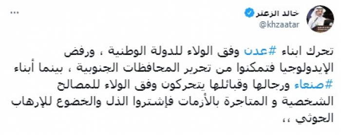 وقال في تغريدة على حسابه بموقع التدوين المصغر تويتر، اليوم إن: "تحرك أبناء عدن وفق الولاء للدولة الوطنية، ورفض الأيديولوجيا فتمكنوا من تحرير المحافظات الجنوبية".