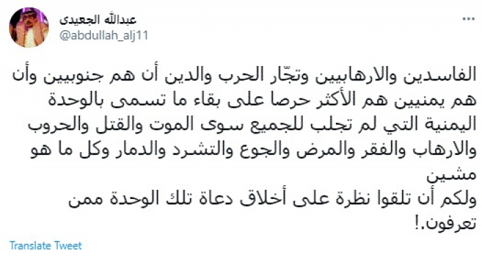 وكتب في تغريدة عبر "تويتر" رصدها "المشهد العربي": "الفاسدين والارهابيين وتجّار الحرب والدين أن هم جنوبيين وأن هم يمنيين هم الأكثر حرصًا على بقاء ما تسمى بالوحدة اليمنية التي لم تجلب للجميع سوى الموت والقتل والحروب والإرهاب والفقر والمرض والجوع والتشرد والدمار وكل ما هو مشين ولكم أن تلقوا نظرة على أخلاق دعاة تلك الوحدة ممن تعرفون".