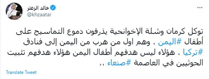 وقال في تغريدة عبر "تويتر" رصدها "المشهد العربي": "توكل كرمان وشلة الإخوانجية يذرفون دموع التماسيح على أطفال اليمن، وهم أول من هرب من اليمن إلى فنادق تركيا، هؤلاء ليس هدفهم أطفال اليمن هؤلاء هدفهم تثبيت الحوثيين في العاصمة صنعاء".