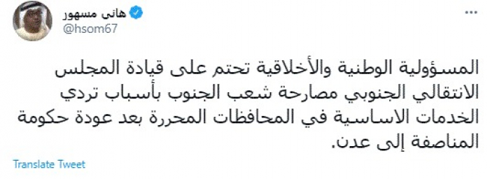 وقال في تغريدة عبر "تويتر" رصدها "المشهد العربي": "المسؤولية الوطنية والأخلاقية تحتم على قيادة المجلس الانتقالي الجنوبي مصارحة شعب الجنوب بأسباب تردي الخدمات الاساسية في المحافظات المحررة بعد عودة حكومة المناصفة إلى عدن".