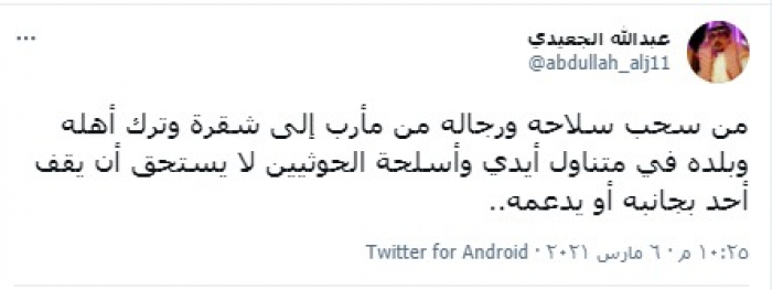 وكتب "الجعيدي" تغريدة عبر حسابه بتويتر، رصدها "المشهد العربي": "من سحب سلاحه ورجاله من مأرب إلى شقرة وترك أهله وبلده في متناول أيدي وأسلحة الحوثيين لا يستحق أن يقف أحد بجانبه أو يدعمه".