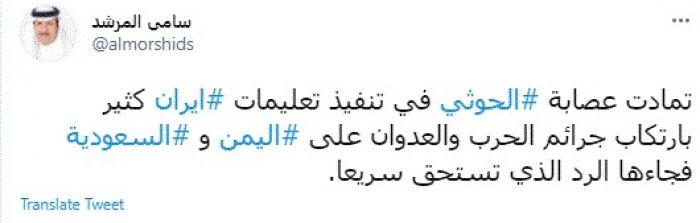 وكتب في تغريدة عبر "تويتر" رصدها "المشهد العربي": "تمادت عصابة الحوثي في تنفيذ تعليمات إيران كثير بارتكاب جرائم الحرب والعدوان على اليمن والسعودية فجاءها الرد الذي تستحق سريعًا".