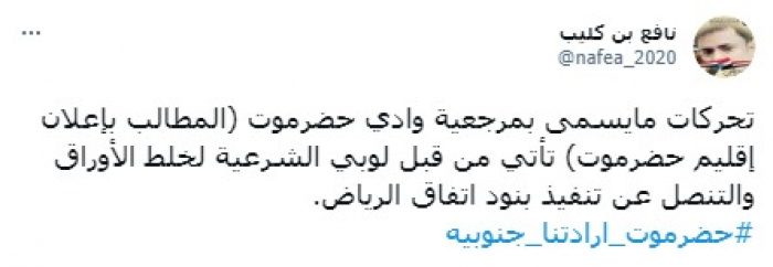 وقال في تغريدة على حسابه بموقع التدوين المصغر تويتر، اليوم إن: "تحركات ما يسمى بمرجعية وادي حضرموت (المطالب بإعلان إقليم حضرموت) تأتي من قبل لوبي الشرعية لخلط الأوراق والتنصل عن تنفيذ بنود اتفاق الرياض".